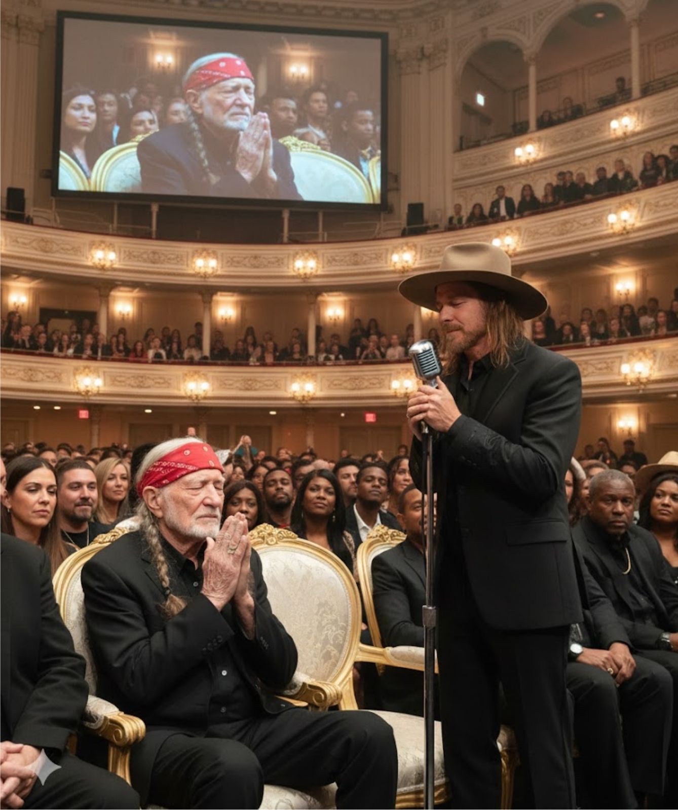 Among fellow greats, Willie sat with his hands clasped, posture still, eyes fixed — not on the crowd, but on his son. In that posture was something rare to witness: not the legend receiving tribute, but a father listening to a prayer he once released into the world, now returned to him with gentleness.