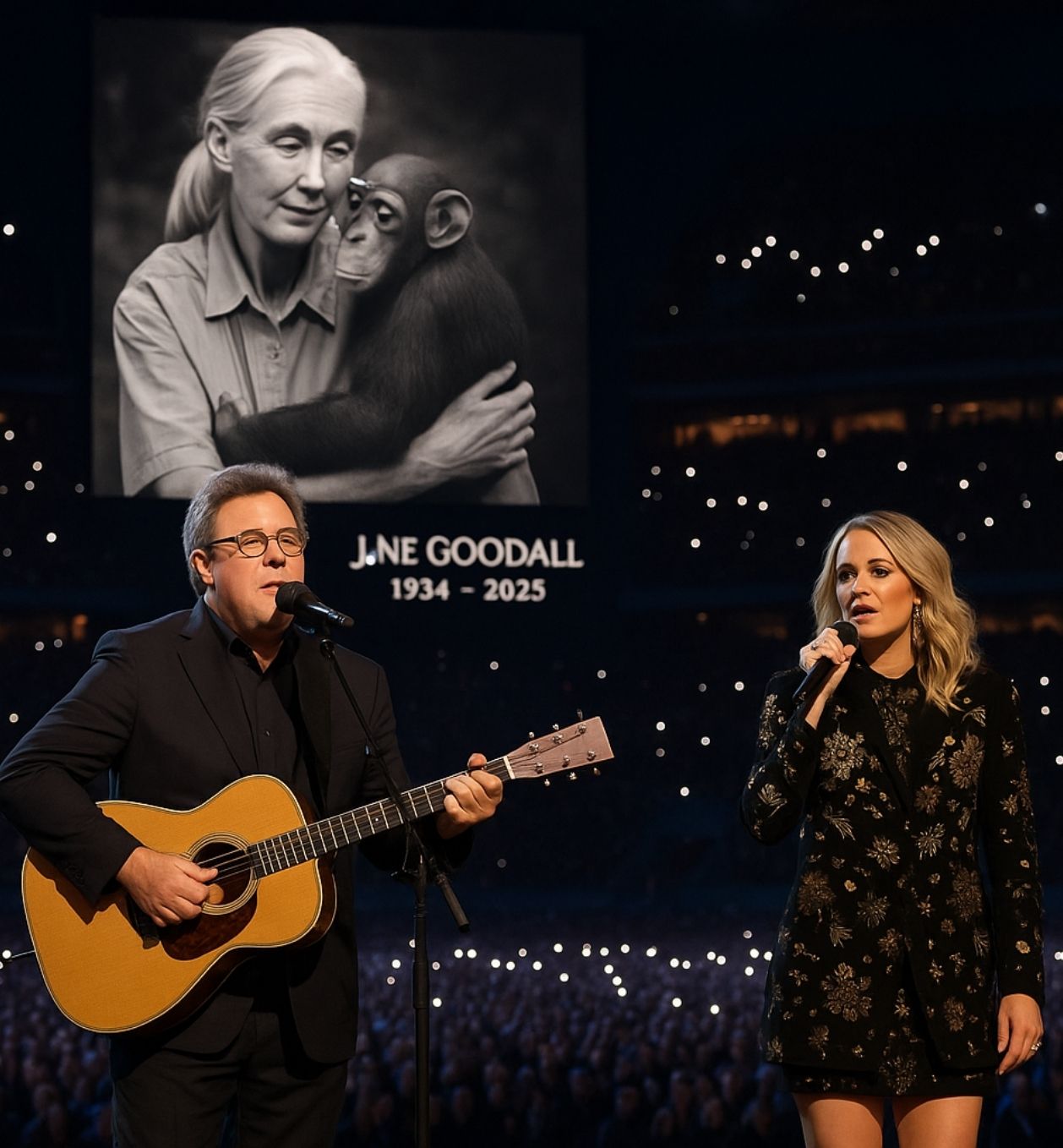Under soft lights and a hushed silence, two of country music’s most beloved voices stepped onto the stage with more than a performance in mind. Vince Gill and Carrie Underwood, guitars cradled close, walked into the spotlight to honor the memory of Jane Goodall, the pioneering conservationist and primatologist who passed away at the age of 91.