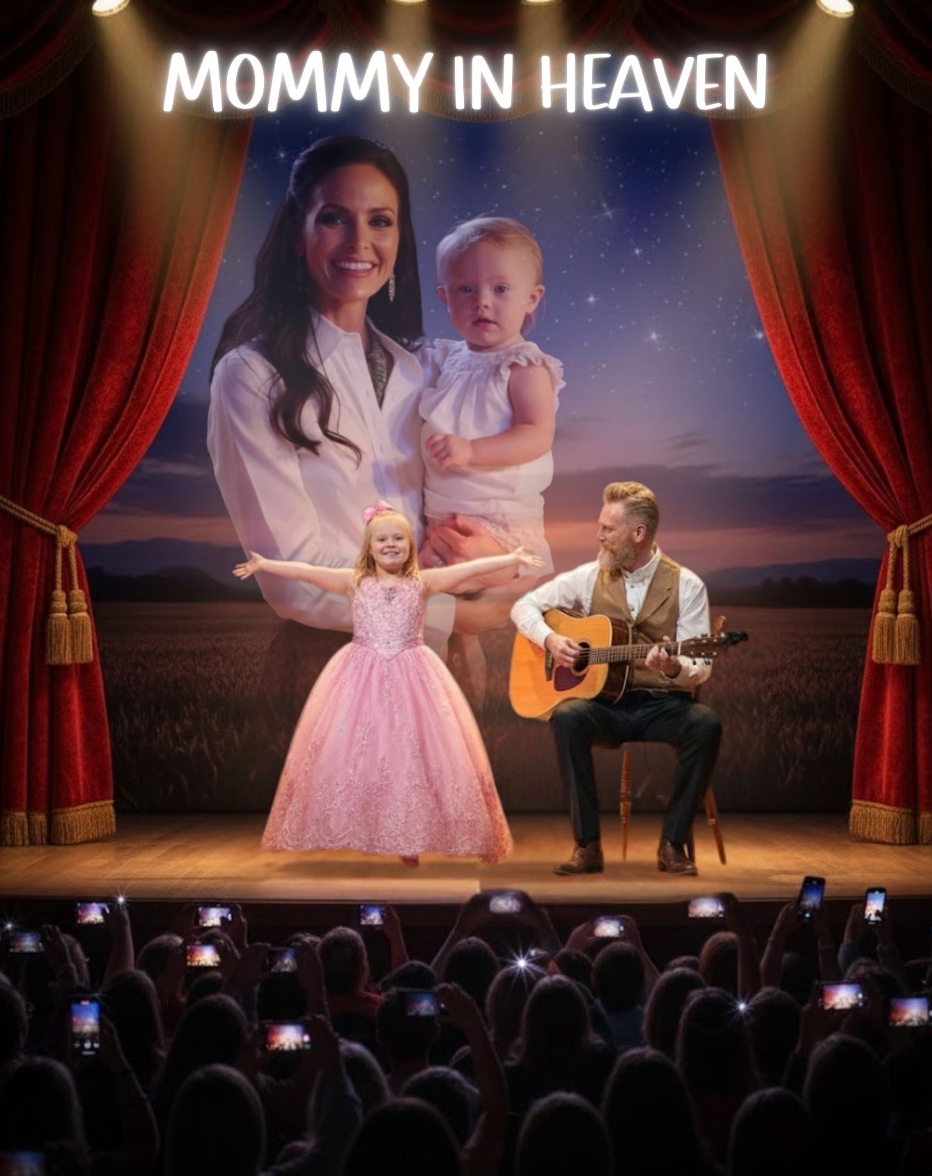 Rory sat with his guitar, steady but visibly emotional, the kind of calm that comes only from love learned through loss. Indiana stood beside him — small, brave, and glowing in the warm Opry lights. Her feet barely filled the space where legends have stood. Her hands rested close to her father’s arm, trusting, certain.