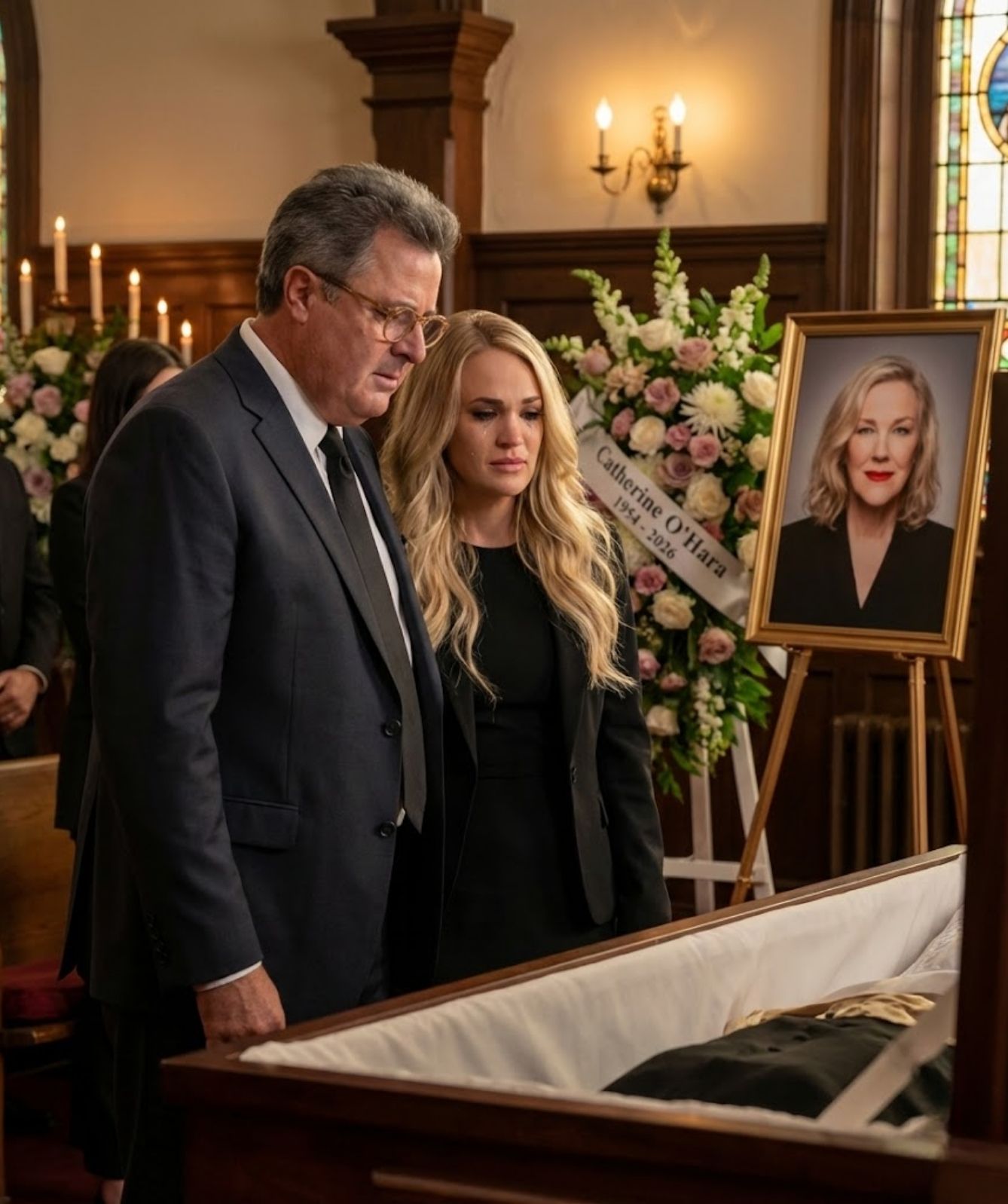 Silence had already claimed the chapel long before anyone stepped forward. It was the kind of quiet that settles not because it is demanded, but because it is understood. Family and close friends had gathered in that shared stillness to honor Catherine O’Hara, a woman whose gentle brilliance made laughter feel personal, intimate, and lasting. Her sudden passing at 71, following a brief illness, had left those present searching for footing in unfamiliar emotional terrain.