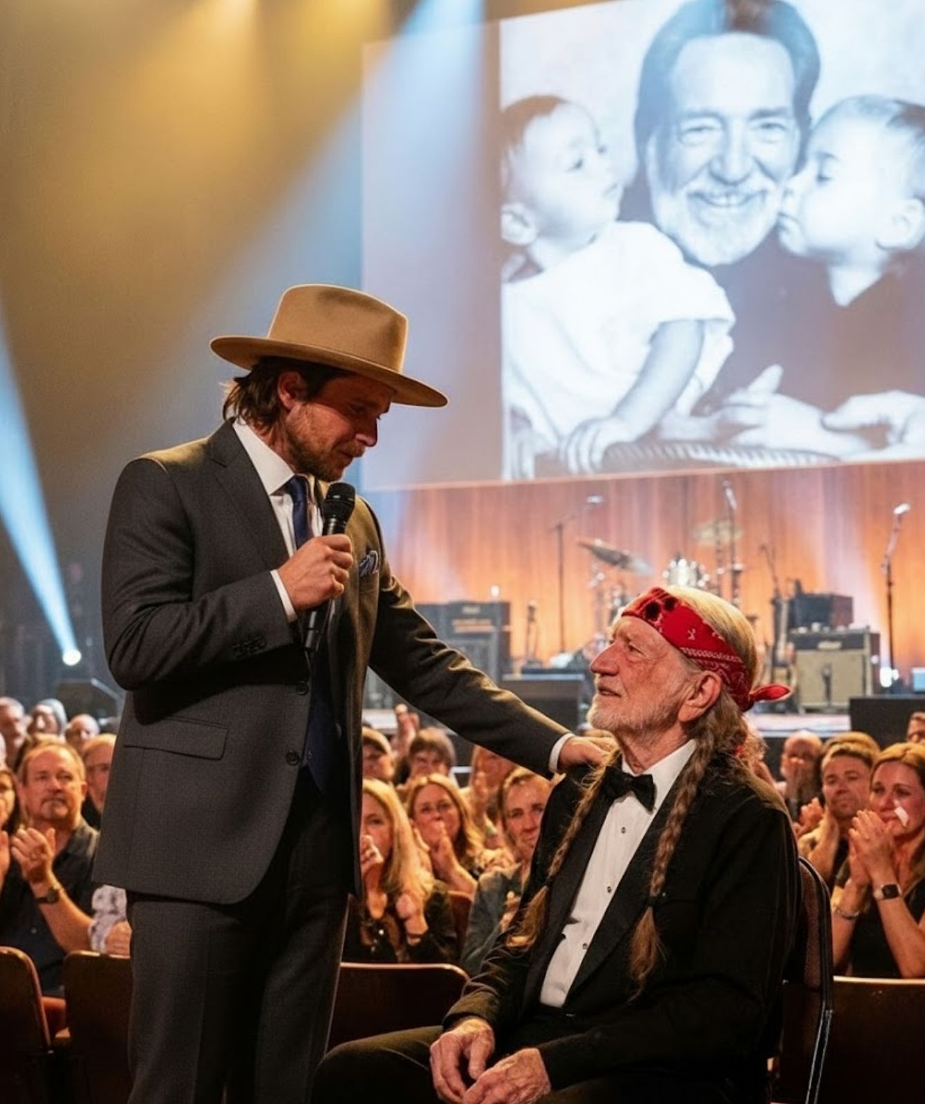 Willie’s shoulders lifted and fell, a small, human motion that said everything. In that instant, the world did not see the outlaw legend, the songwriter whose words shaped generations, the icon etched into American music history. They saw a dad — a father hearing love come back to him through the voice of his son.