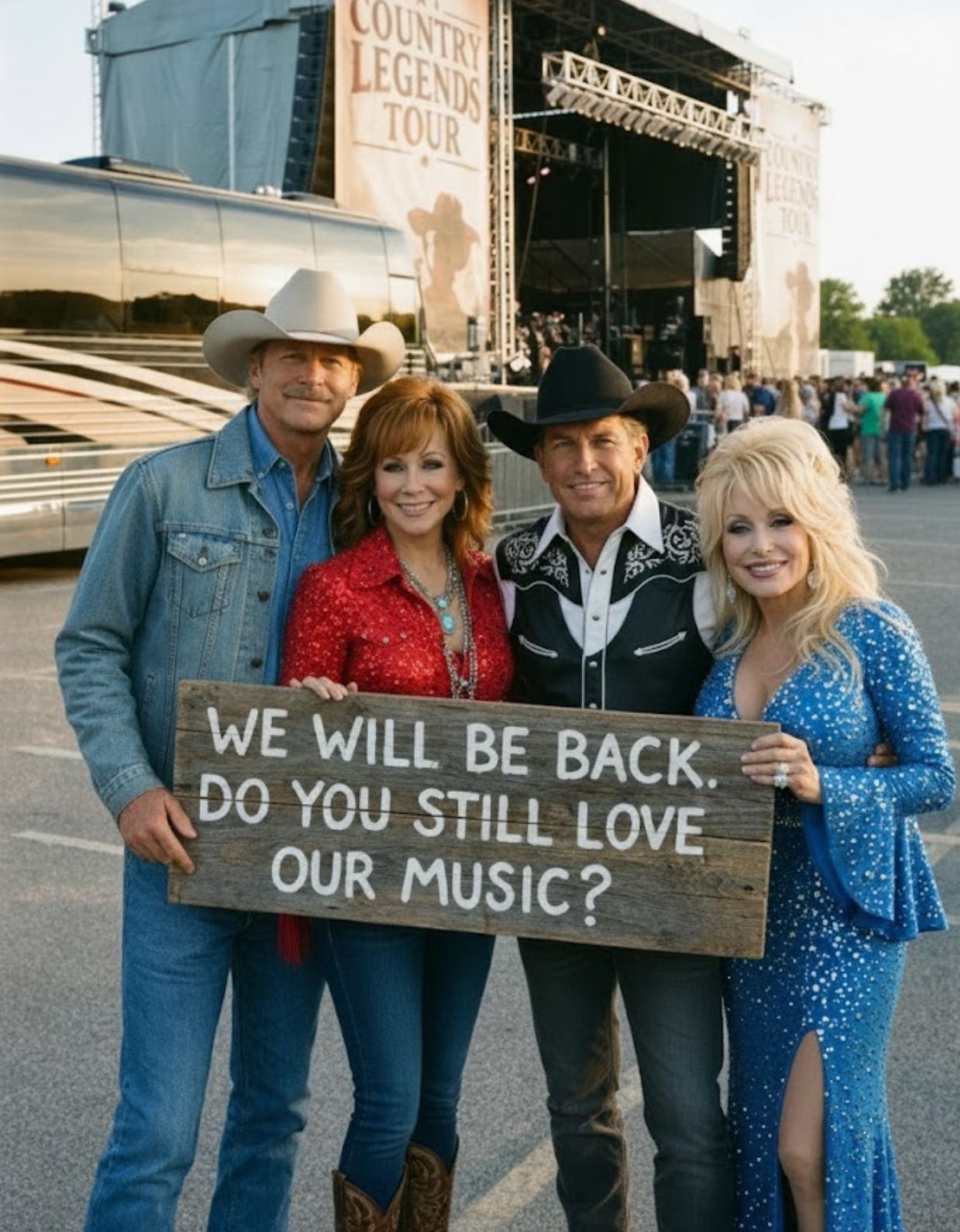 As midnight approached, four pillars of the genre stepped into the moment not as monuments to a past era, but as living proof that tradition survives because it is lived. George Strait, Alan Jackson, Reba McEntire, and Dolly Parton didn’t arrive to chase trends. They arrived to keep a promise.