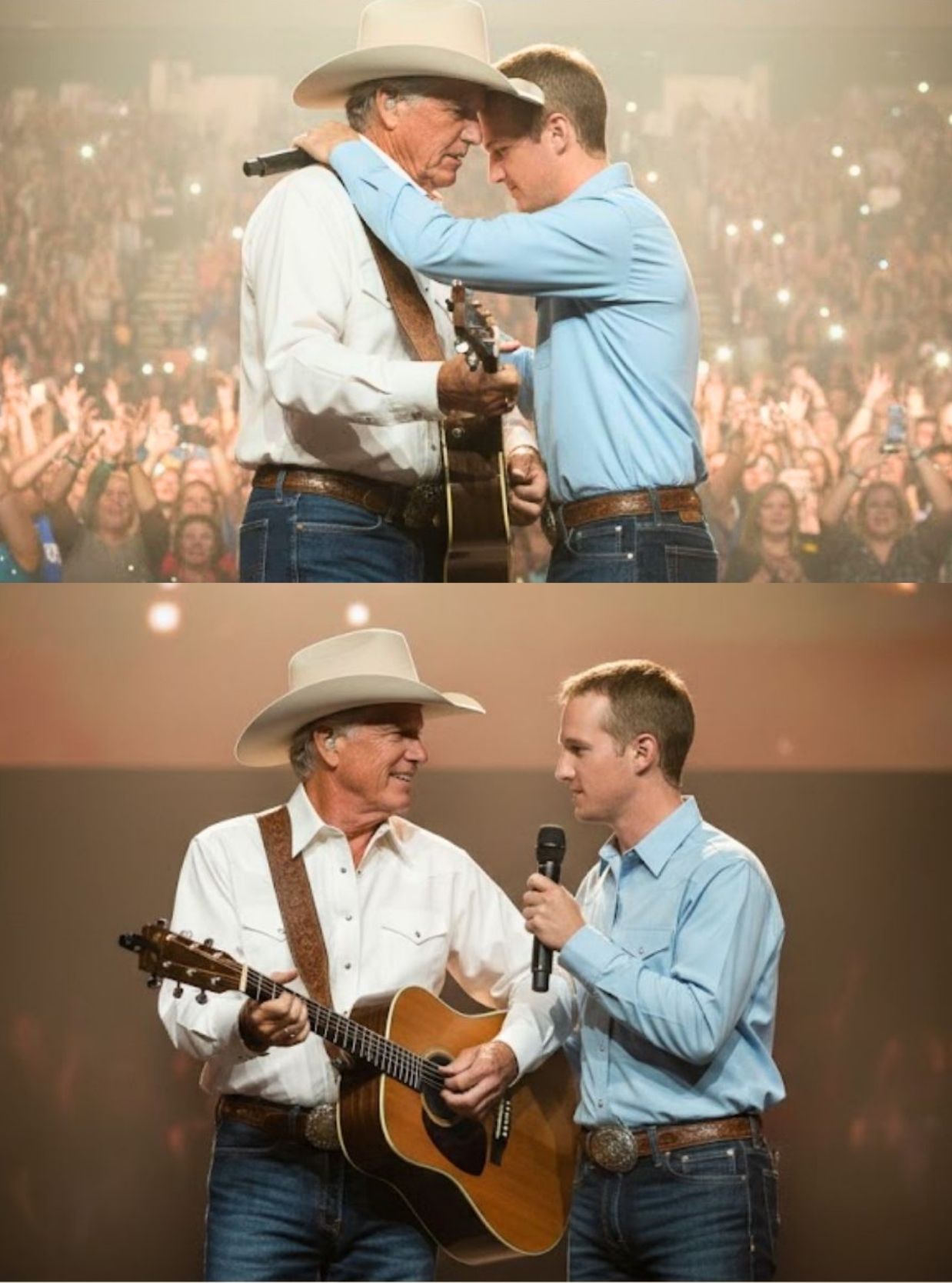 As the final encore began, the lights dimmed. The crowd hushed. And from the shadows, a figure stepped into the glow — Bubba Strait, George’s son and longtime songwriting partner. The arena erupted in applause, then fell into reverent silence as father and son embraced.