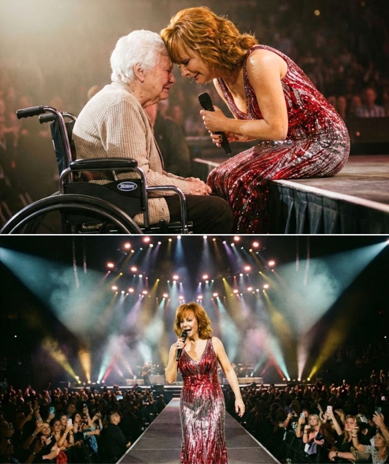 She moved slowly, deliberately, toward the front row—toward a silver-haired woman seated in a wheelchair. This was not a fan plucked from the crowd. This was not a gesture planned for effect. This was her mother—the woman who once sold eggs to buy her daughter’s first guitar, who learned sacrifice before applause ever existed, who believed long before the world did.