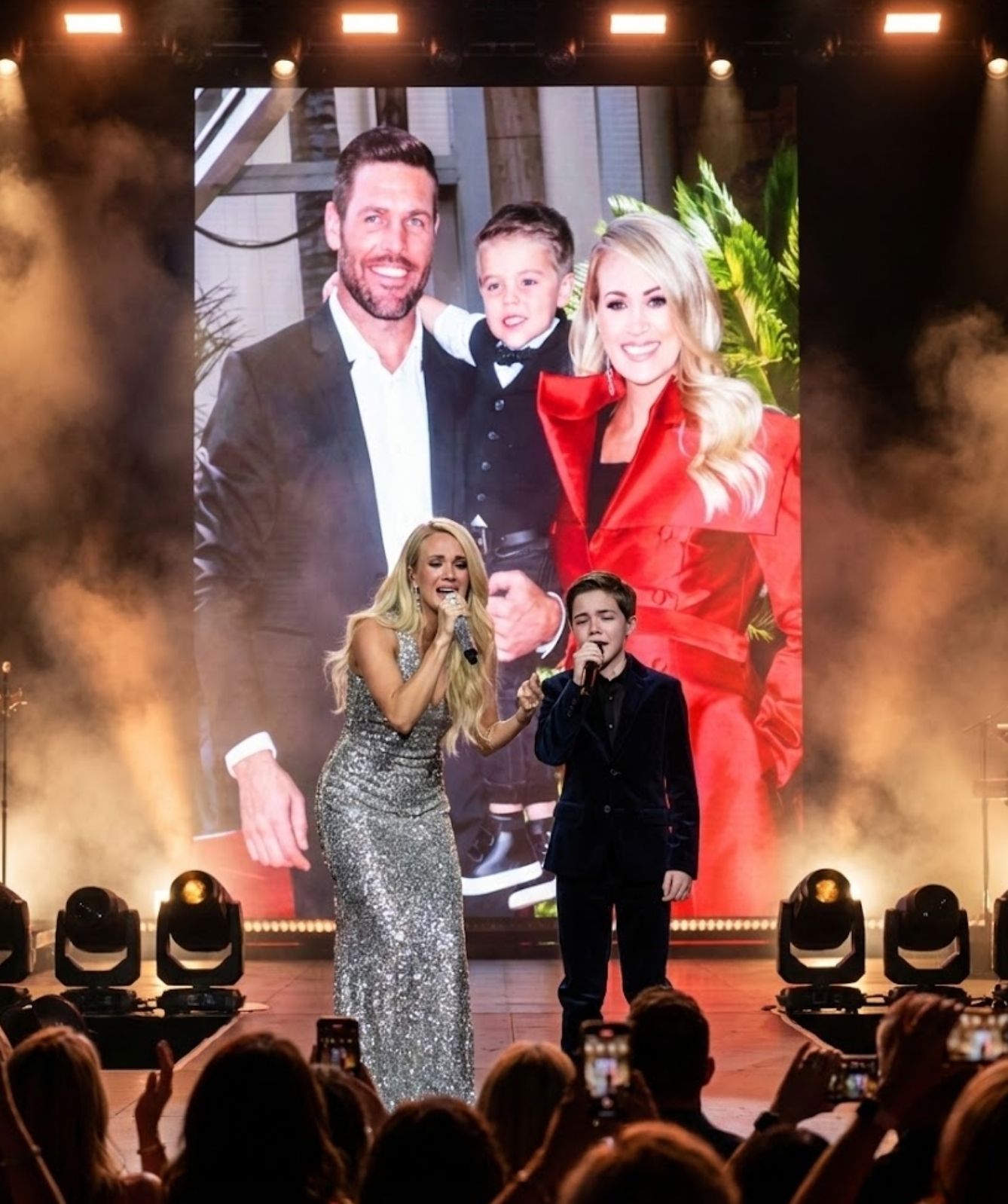 On this night, Carrie Underwood stood at center stage, steady and composed, the way she has done countless times before. Yet something was different. The lights felt warmer. The room felt closer. And beside her stood her young son, small hands wrapped around a microphone far too big for him, eyes wide with wonder rather than fear.