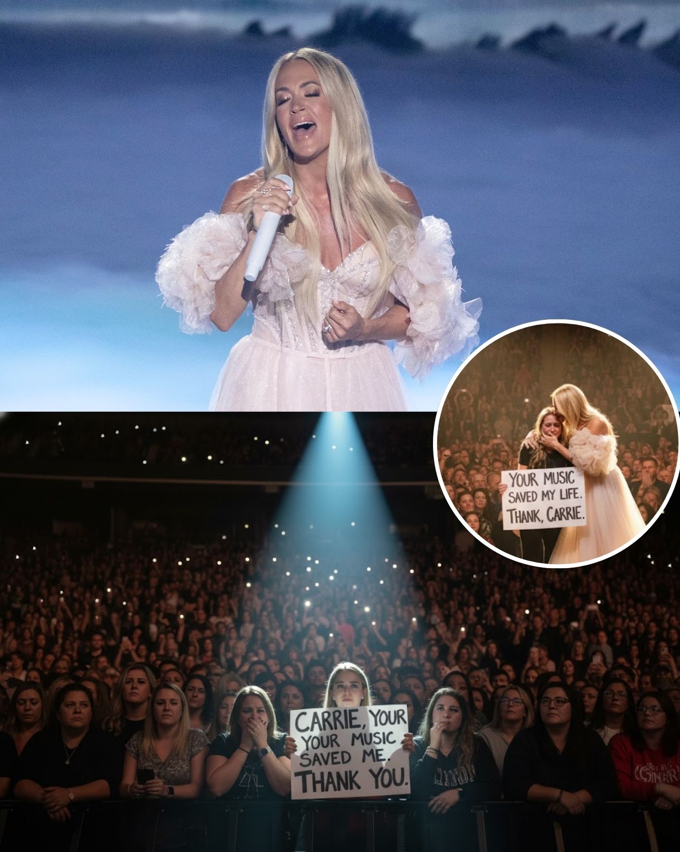 What happened next was unlike anything ever seen at one of her shows. Carrie began singing “Something in the Water,” a cappella. No lights, no band, no spectacle — just her voice, trembling and pure, filling the air like a prayer. Fans began singing with her, their voices blending in a chorus of faith and gratitude that echoed through the arena.