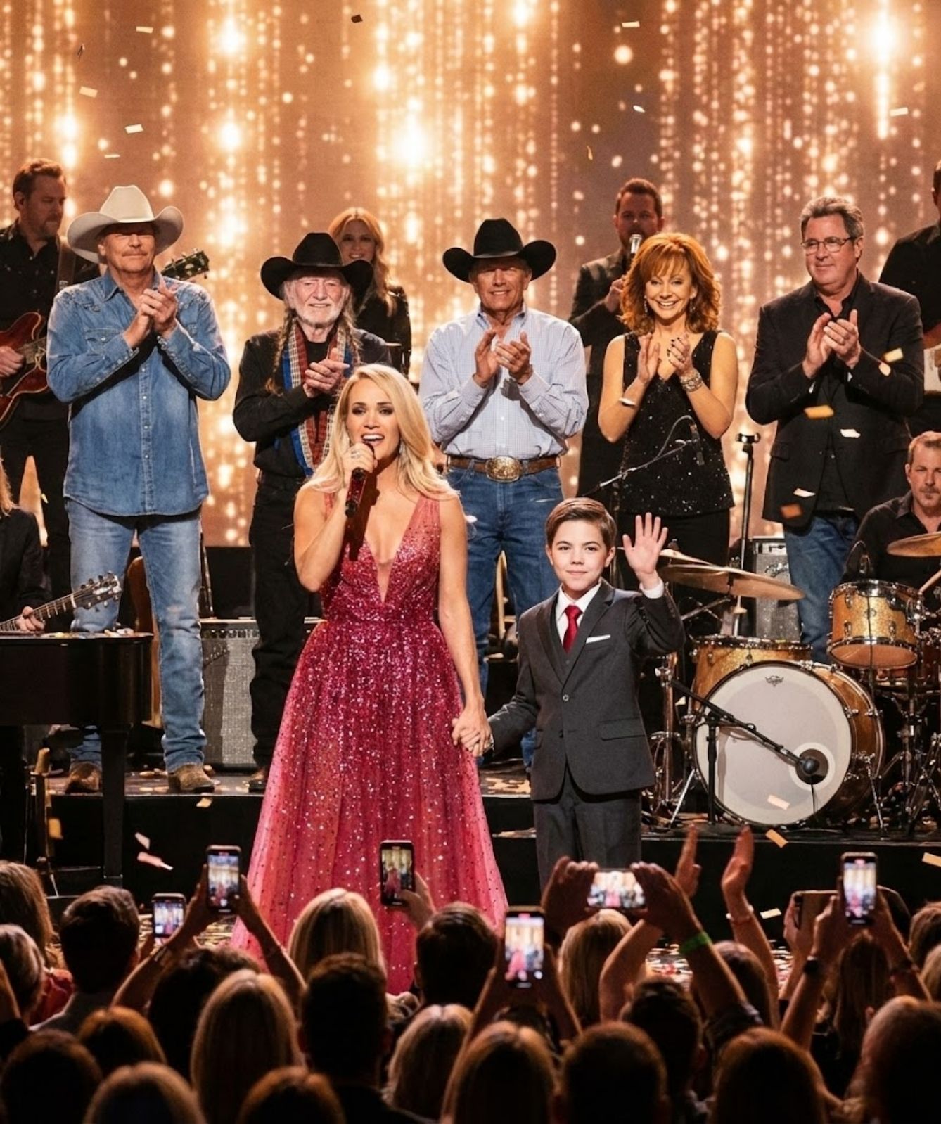 As the lights softened and the crowd settled into a hush, Carrie Underwood stepped forward—not with spectacle, but with intention. She did not command the stage. She opened it. And then, in a gesture that felt almost unreal, she reached back and gently brought her young son into the light beside her.