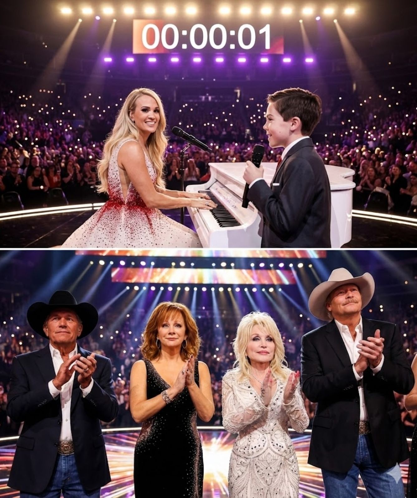 As the countdown ended and voices prepared to erupt, Carrie did something no one saw coming. She raised her hand — not to sing, not to command the stage, but to pause the world. The music softened. The lights dimmed just enough. And then she reached backstage and brought forward the one person no one had prepared to see.