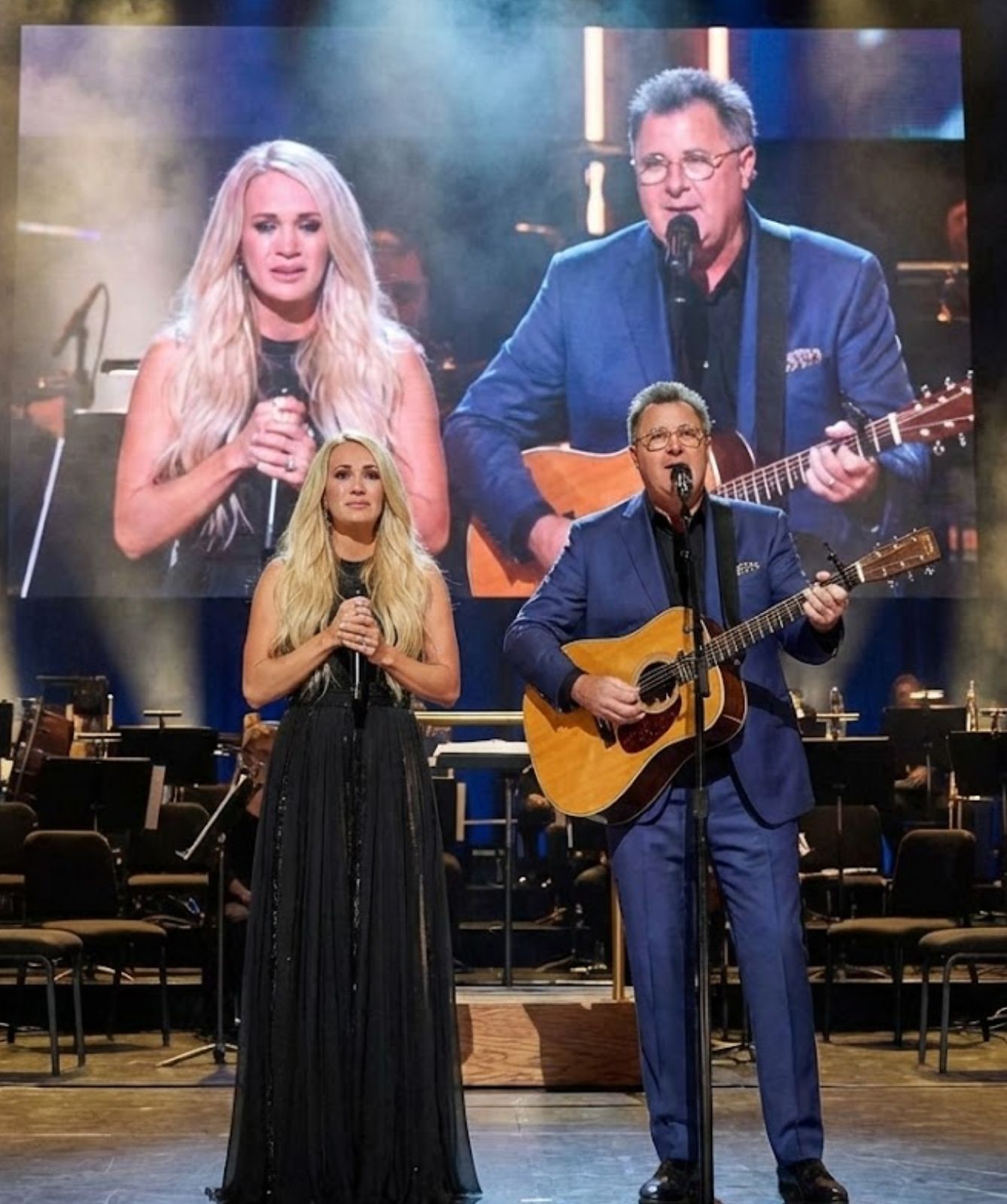 Carrie’s voice lifted the melody upward, as if pointing toward hope rather than certainty. Vince’s voice grounded it, reminding everyone that faith, like music, lives in both questions and answers. Together, they created balance—a conversation between ascent and foundation, between innocence and understanding.