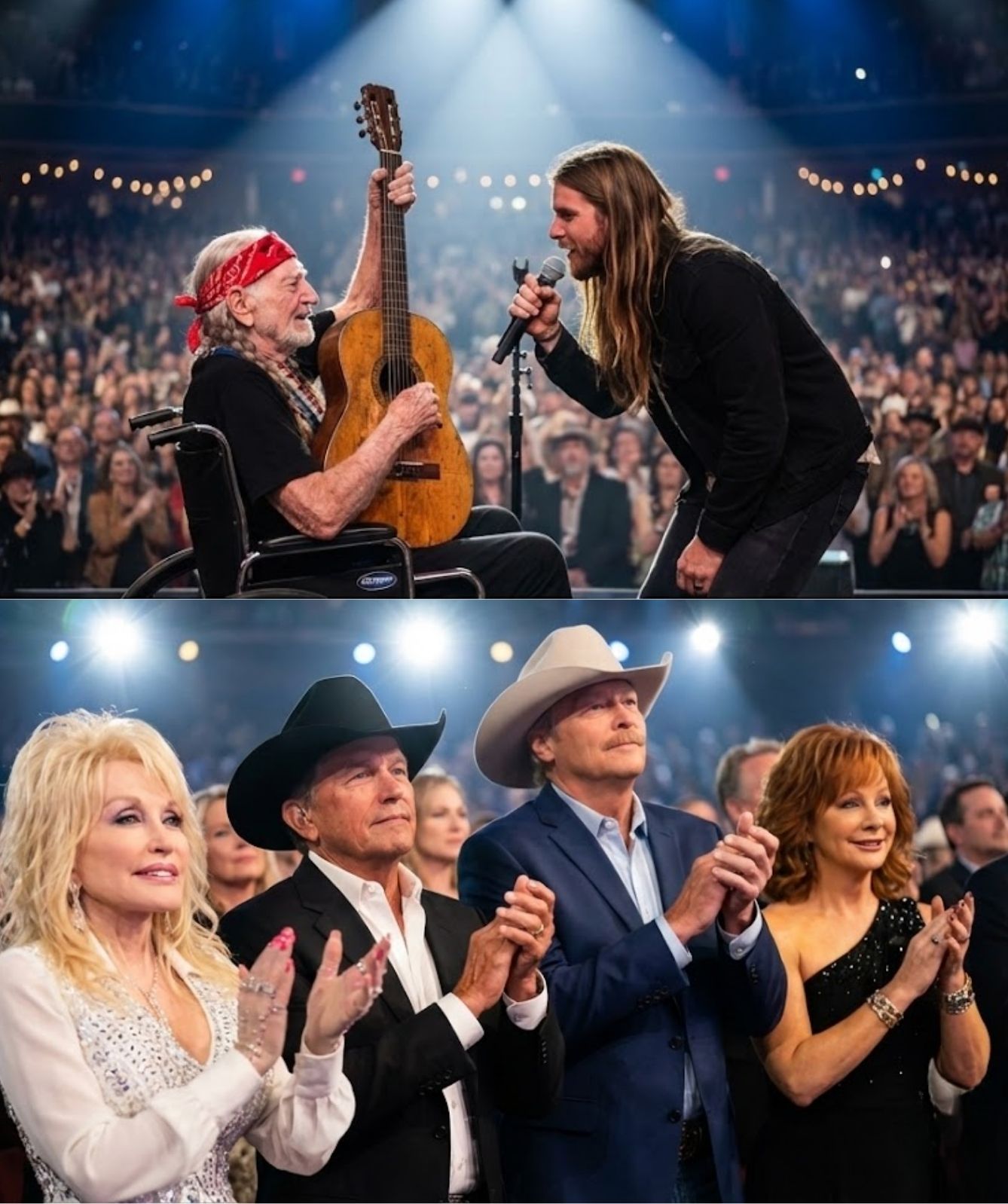 Under the open sky, surrounded by fellow country legends and framed by lights that shimmered like constellations, father and son shared a microphone as the clock hovered on the edge of a new beginning. The crowd sensed it instantly. The noise softened. The energy changed. Time itself seemed to slow, as if the world knew it was about to be asked to listen.
