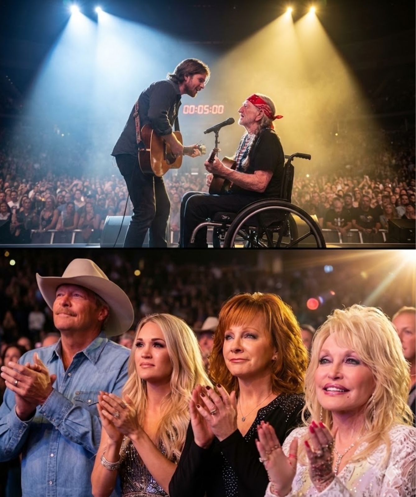 Surrounded by country royalty, artists who had spent decades sharing roads, songs, and losses with Willie, the scene shifted from celebration to something deeply personal. This wasn’t an encore. This wasn’t a surprise guest spot. This was a father choosing to greet the future with his son beside him.