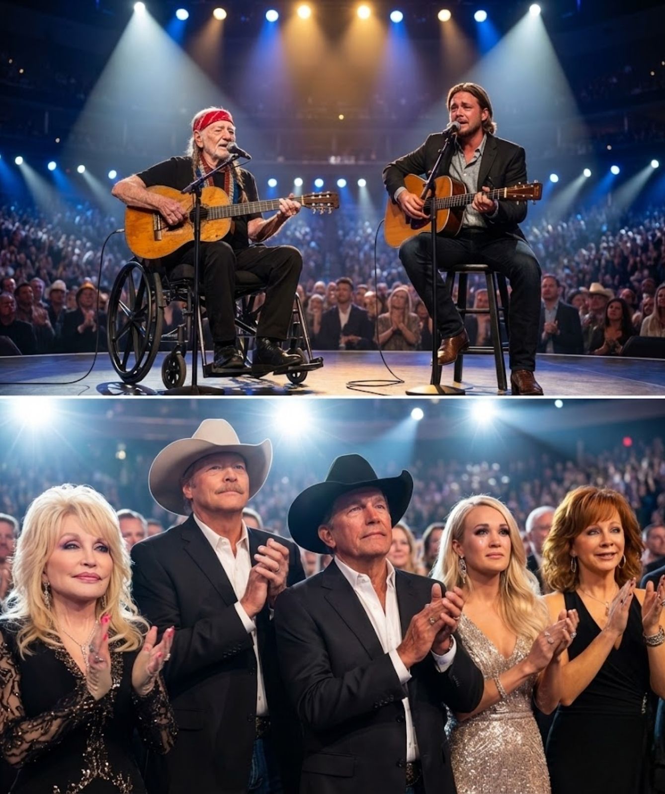 Around them stood country music icons — artists who had lived entire lifetimes on stages like this one. Yet in that instant, titles dissolved. Awards vanished. There was only a father and a son, standing shoulder to shoulder as a new year waited to be born.