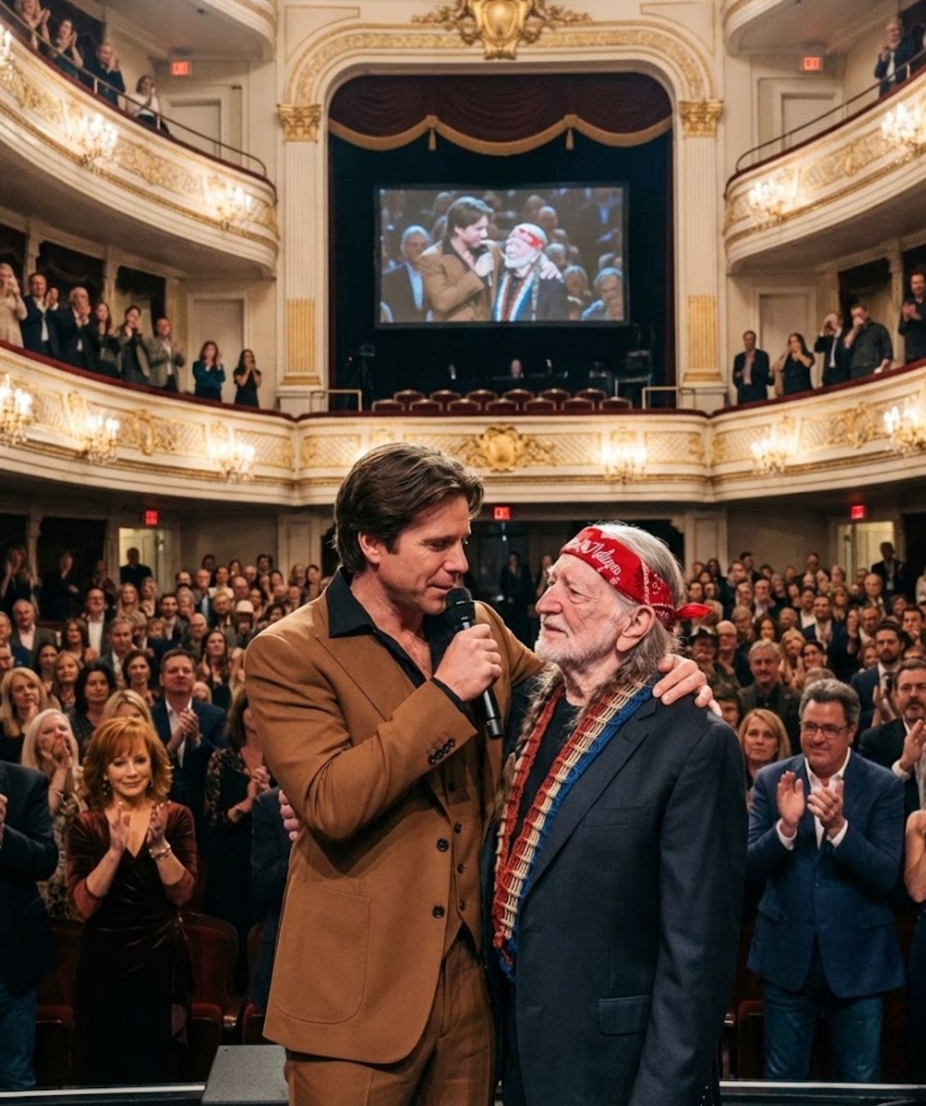 Willie Nelson stood with the stillness of a man who has lived inside history rather than chased it. The years rested easily on his shoulders — not as weight, but as wisdom. Beside him stood Lukas Nelson, not as an echo, not as a continuation, but as his own truth made visible.