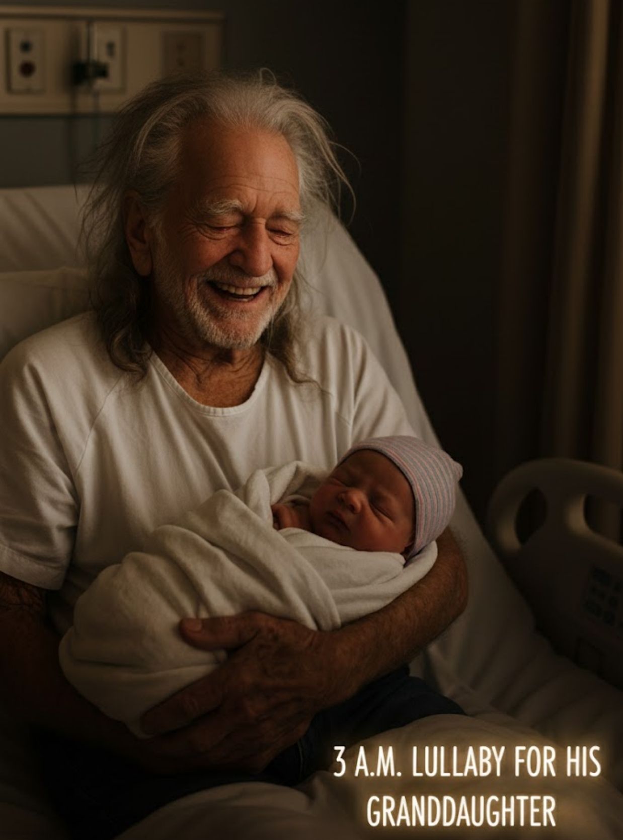 One of those moments happened in a quiet Texas hospital room, long before sunrise, at 3 a.m., when the halls were still, the lights were low, and the world felt small enough for a miracle to slip through unnoticed. In that room stood Willie Nelson, barefoot, dressed not in his familiar stage clothes but in a simple hospital gown, the kind of garment that strips away fame and leaves only the truth of a man. In his arms: his newborn granddaughter, tiny Raelyn, wrapped in a blanket no bigger than his hands.