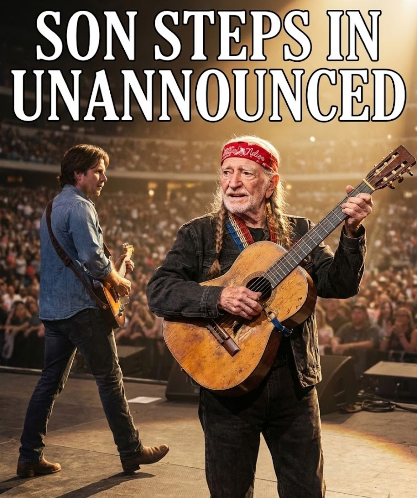 Before the first note could leave Willie’s hands, a quiet movement unfolded at stage right. No announcement. No cue from the lights. No flourish meant to turn heads. Lukas Nelson walked out, guitar already strapped on, steps unhurried, eyes focused. He did not rush. He did not hesitate. He simply arrived.
