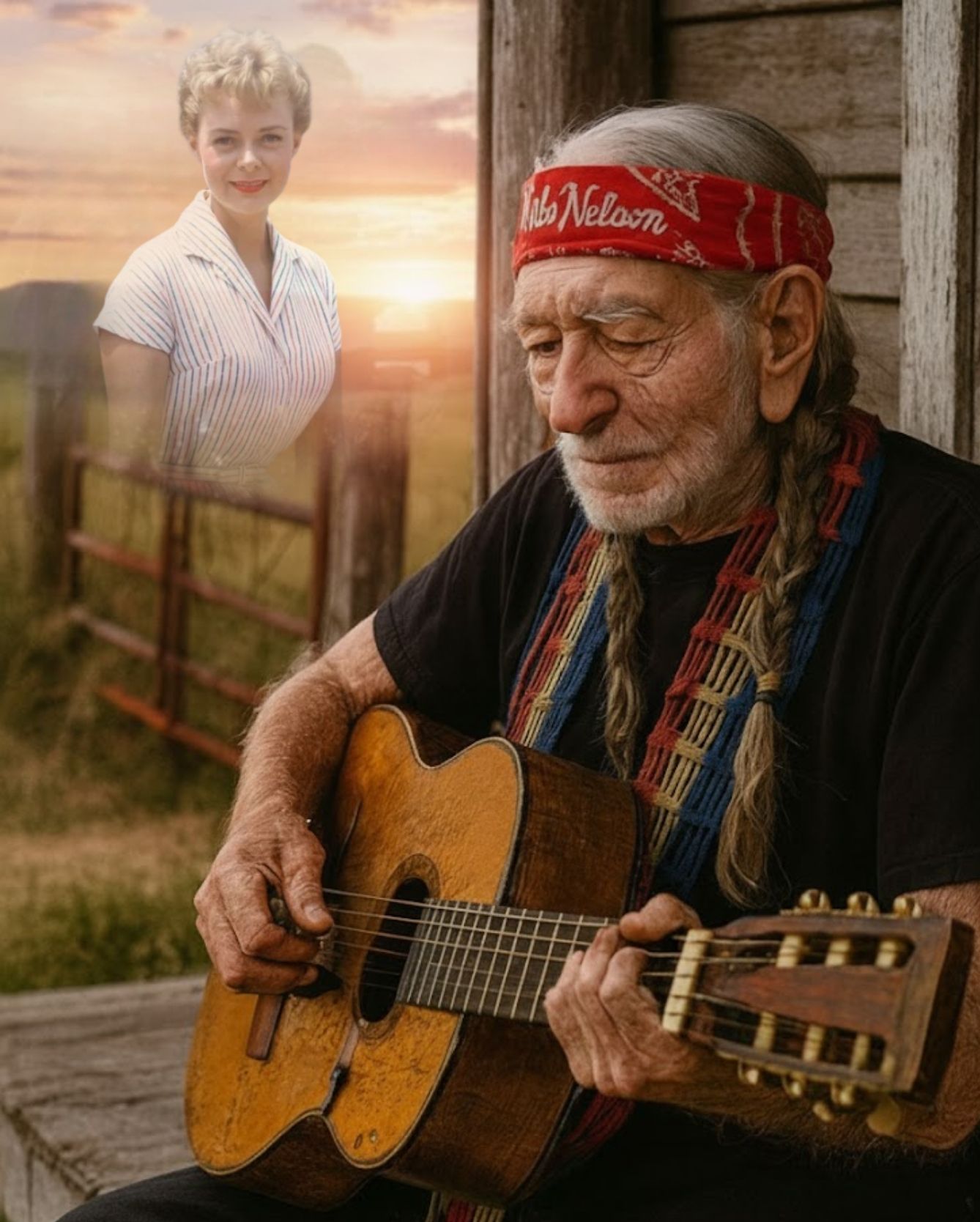 When June Lockhart passed away, a deep and familiar stillness settled over Luck, Texas โ the kind of silence that only comes when the world has lost one of its brightest lights. On that quiet evening, Willie Nelson sat alone on the porch of his ranch, his weathered hands resting on his old guitar, Trigger. The sun was slipping beneath the hills, painting the sky in gold and amber, when neighbors said they heard it: a soft, haunting melody drifting through the dusk, tender and sorrowful โ a song no one had ever heard before.