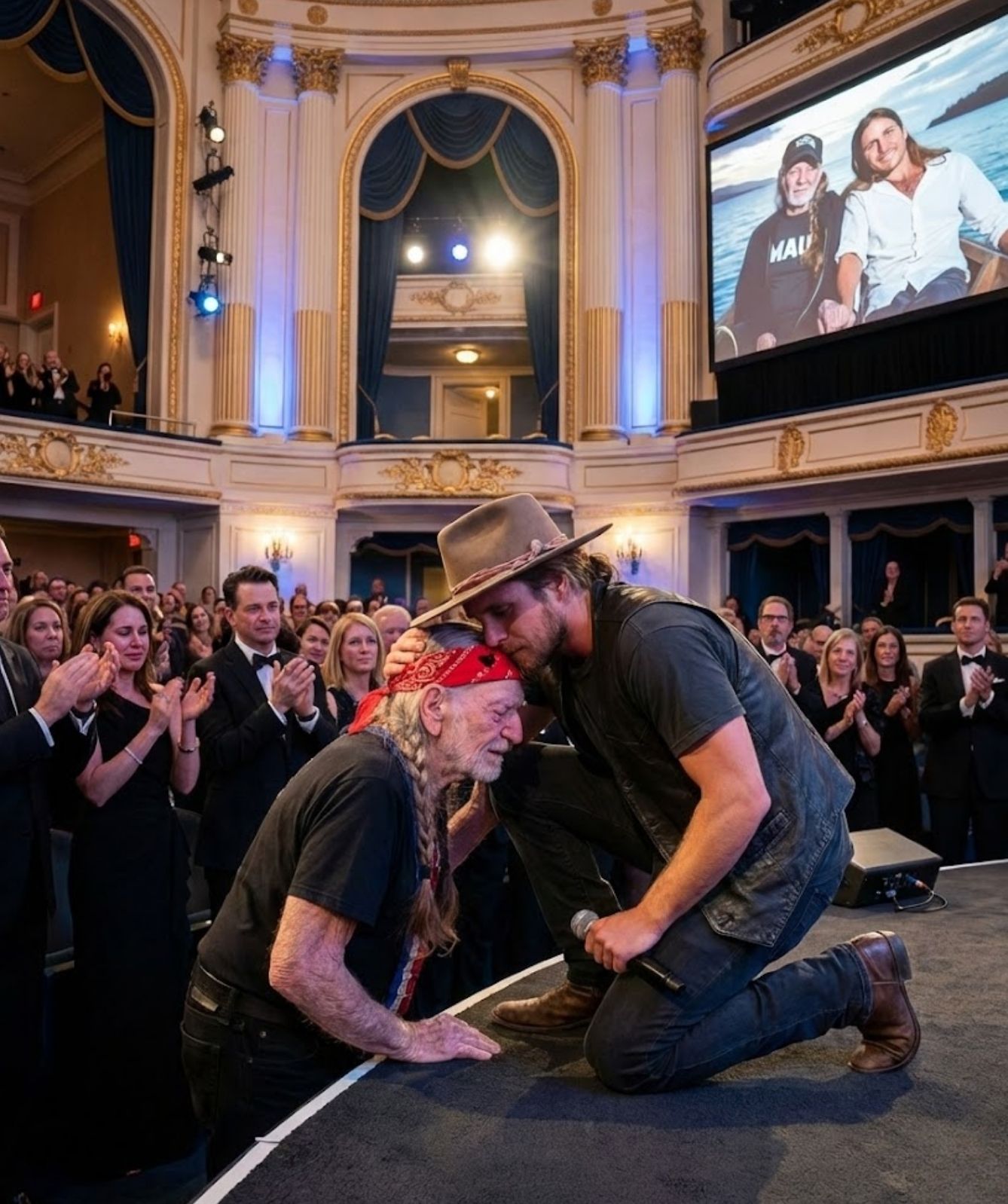 Those watching saw Willie’s shoulders begin to tremble. Not dramatically. Not loudly. Just enough to reveal what words could not. This was a father hearing his own soul echoed back to him — shaped by years of teaching, patience, and example. Hearing proof that nothing he had poured into his music, his life, or his family had been lost.