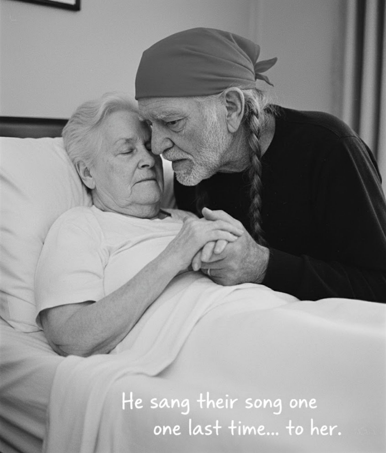 The tape begins with nothing but the faint hum of a bedside lamp and the quiet shuffle of Willie settling into his chair. You can hear the heaviness of his breath — age, miles, memories — and then, after a long pause, he leans close to her ear and begins to sing.