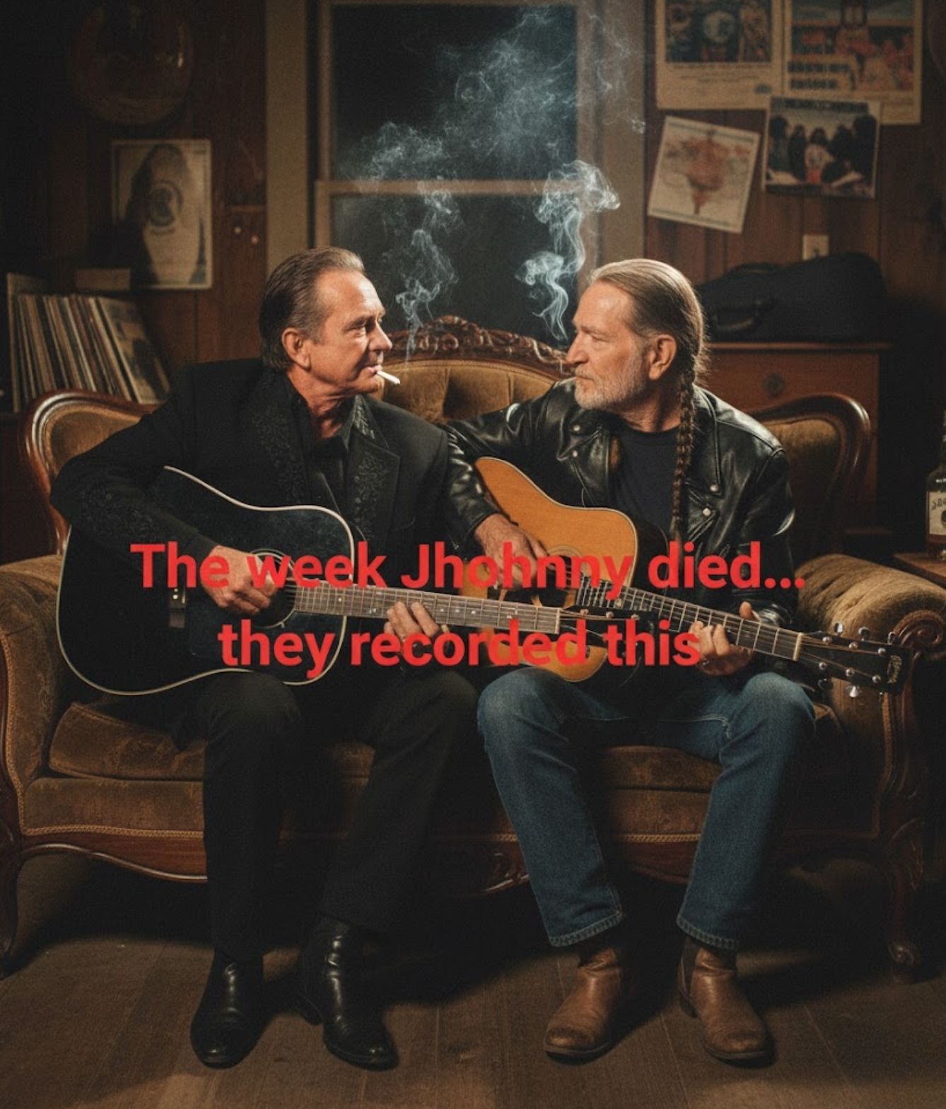 They began trading verses, passing the melody back and forth like a torch they both knew they were getting too tired to hold. Johnny’s voice carried a trembling gravity, the sound of a man singing not for the world, but for the friend sitting across from him. Willie’s reply came soft and cracked at the edges, the kind of crack that only comes when you’re trying not to cry.