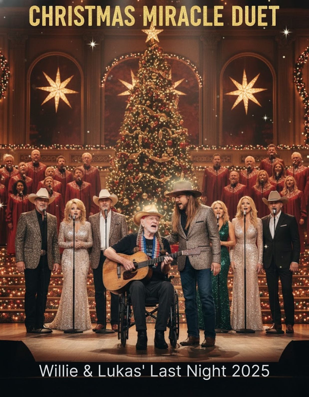 Surrounded by country music legends who had walked decades of history beside him, Willie stepped under the warm holiday lights and welcomed his son Lukas to stand at his side. No announcement could have prepared the room for what followed. There was no sense of spectacle — only a shared awareness that something rare was about to be entrusted to everyone listening.