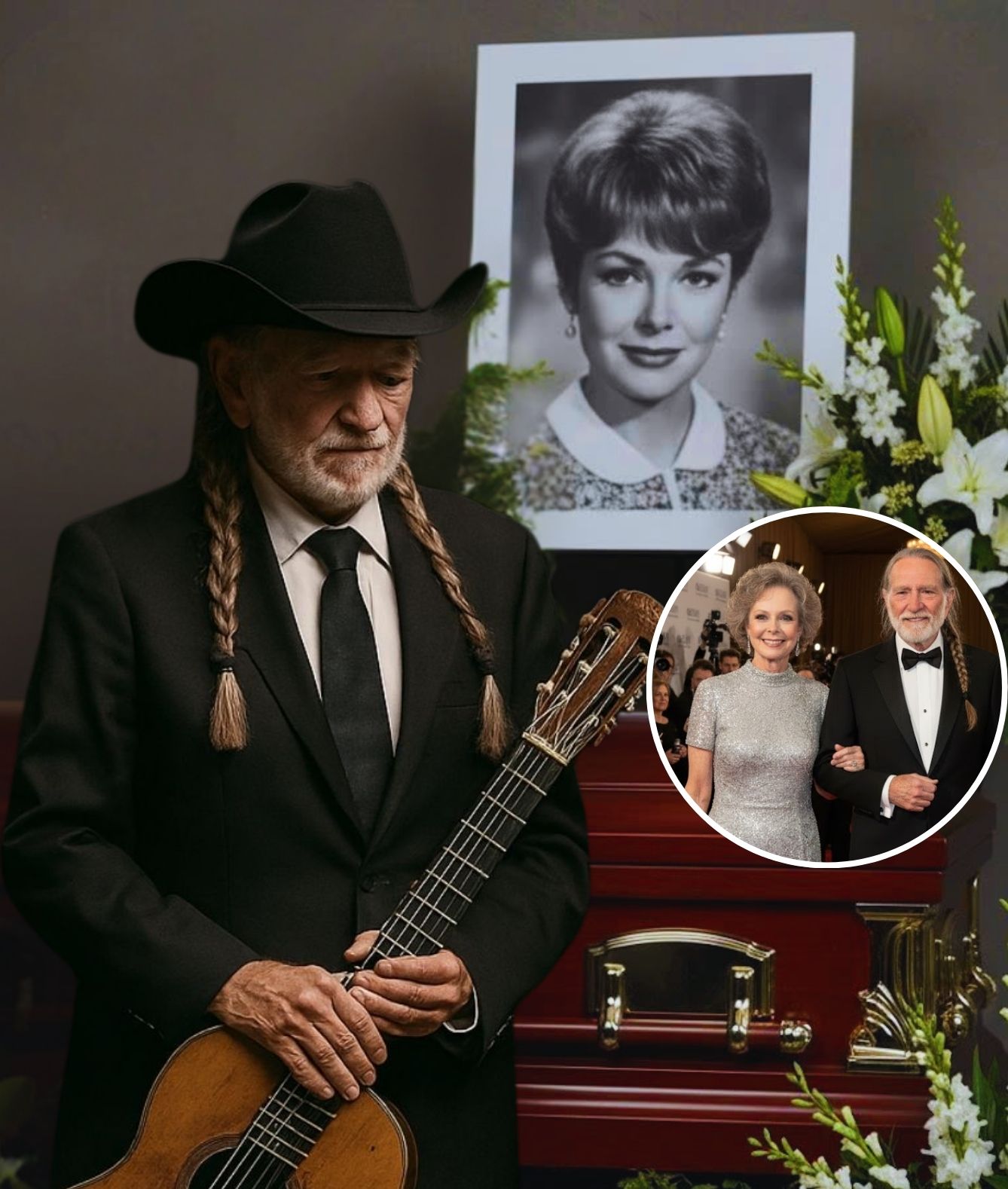 When attendants wheeled Willie forward to speak, the room fell utterly silent. At 92, the country legend moved slowly, his frame frail but his spirit steady. He removed his hat, looked toward June’s casket — draped in white roses, framed by photographs of her life — and for a long moment, said nothing at all. The pause was almost holy. Then, in that soft Texas drawl that has carried across generations, he began to speak.